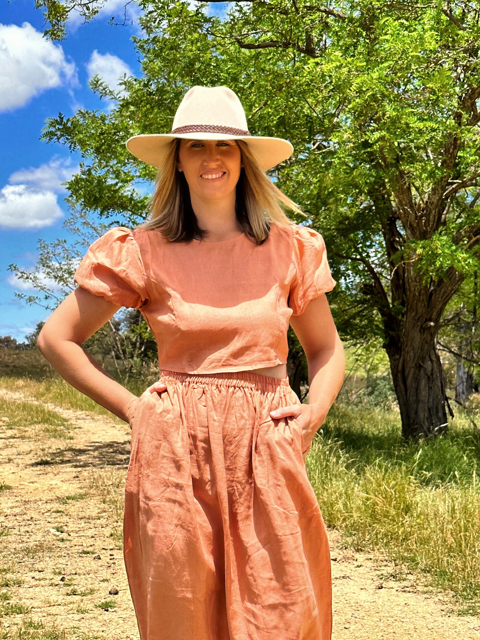 The Mima linen blouse in ‘dusty rust’ features a higher neckline with a beautiful open tie back detail that can be adjusted.. The blouse features higher cut sleeves with volume puff detail. Style it with our matching Maise skirt, or wear it with high-waisted denim jeans.